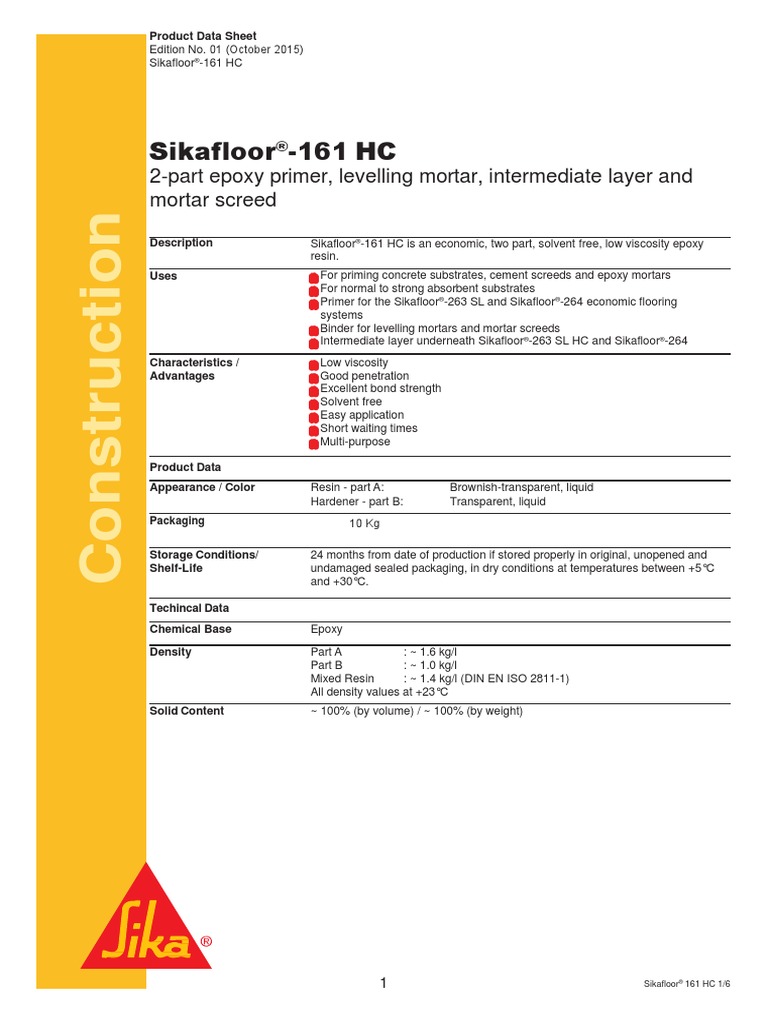 Sikafloor 161 HC 2Part Epoxy Primer, Levelling Mortar, Intermediate Layer and Mortar Screed Sikafloor 161 Epoxy Primer Suitable for use in hot and tropical climatic conditions. Suitable for use in hot and tropical climatic conditions. Fast setting epoxy primer/ basecoat for high performance floor finishes Sikafloor 161 Epoxy Primer.